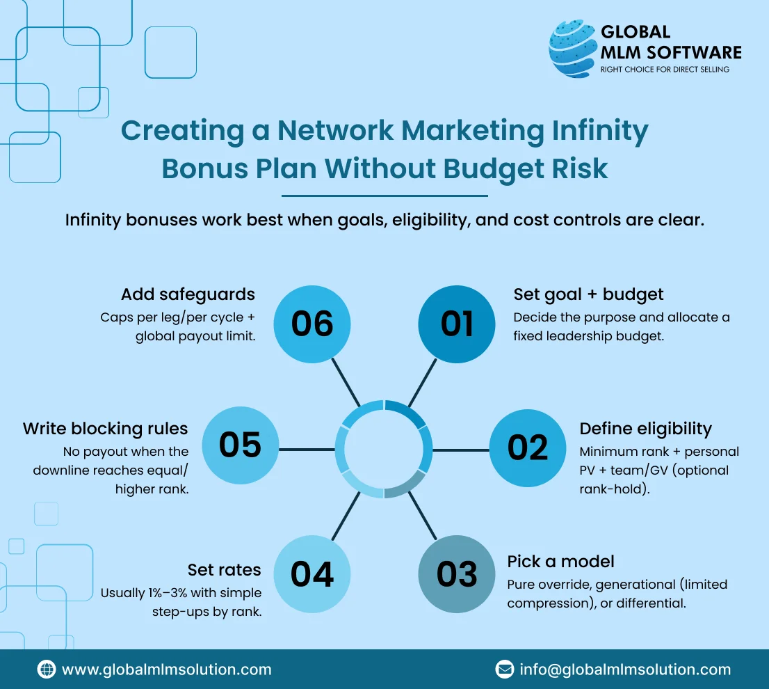 An infinity bonus can boost leadership motivation and long-term team growth—but only if it’s built with clear goals, tight qualification rules, and cost controls. Use this 6-step framework to design a structure that’s profitable, scalable, and easy to explain.