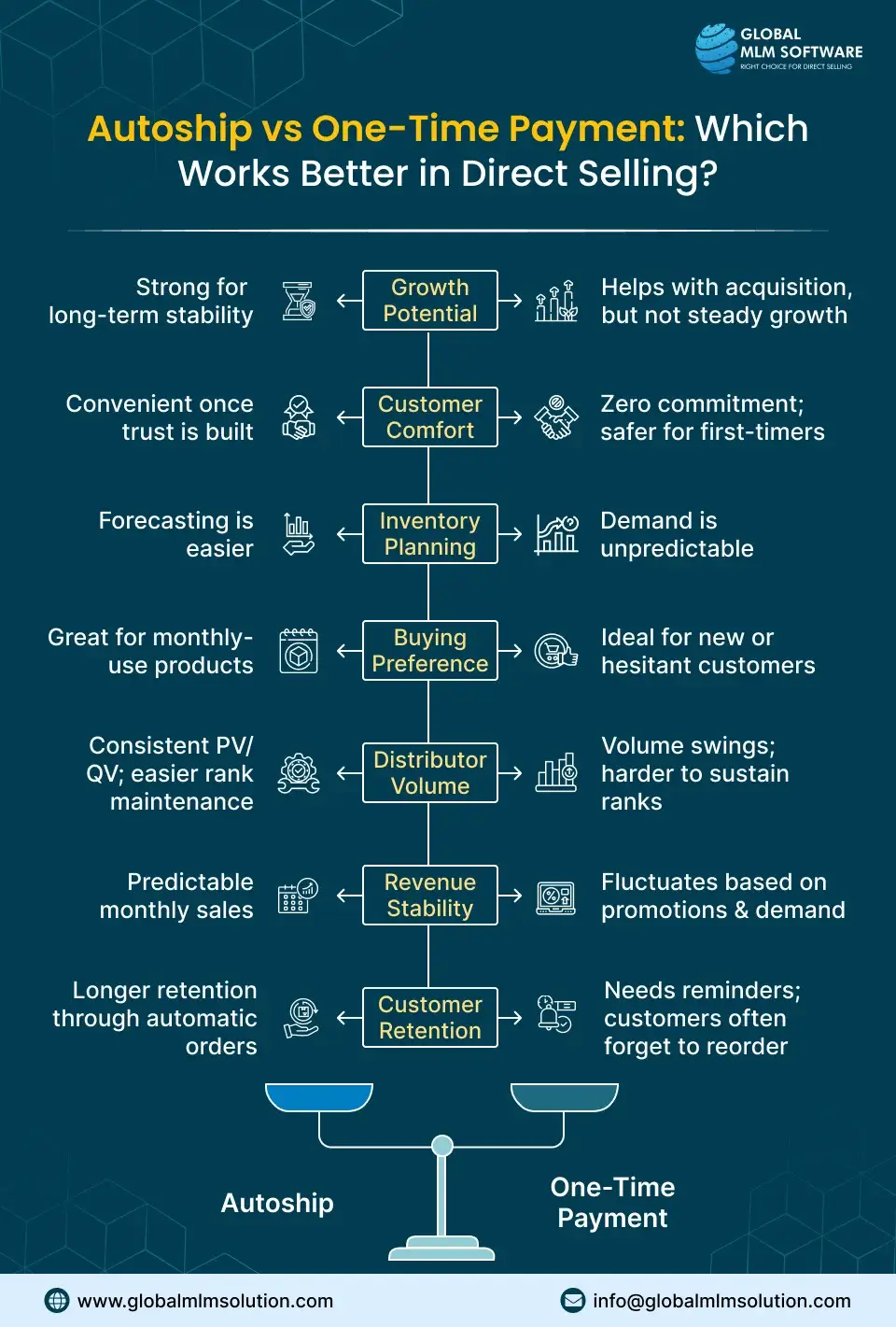If youâve spent any time in direct selling, you already know that the way customers buy your products can completely change how your business behaves. Some companies lean heavily on direct selling autoship because it keeps orders rolling in without much effort. Others prefer sticking to one-time purchases, especially when theyâre trying to win over new buyers who arenât ready to commit.