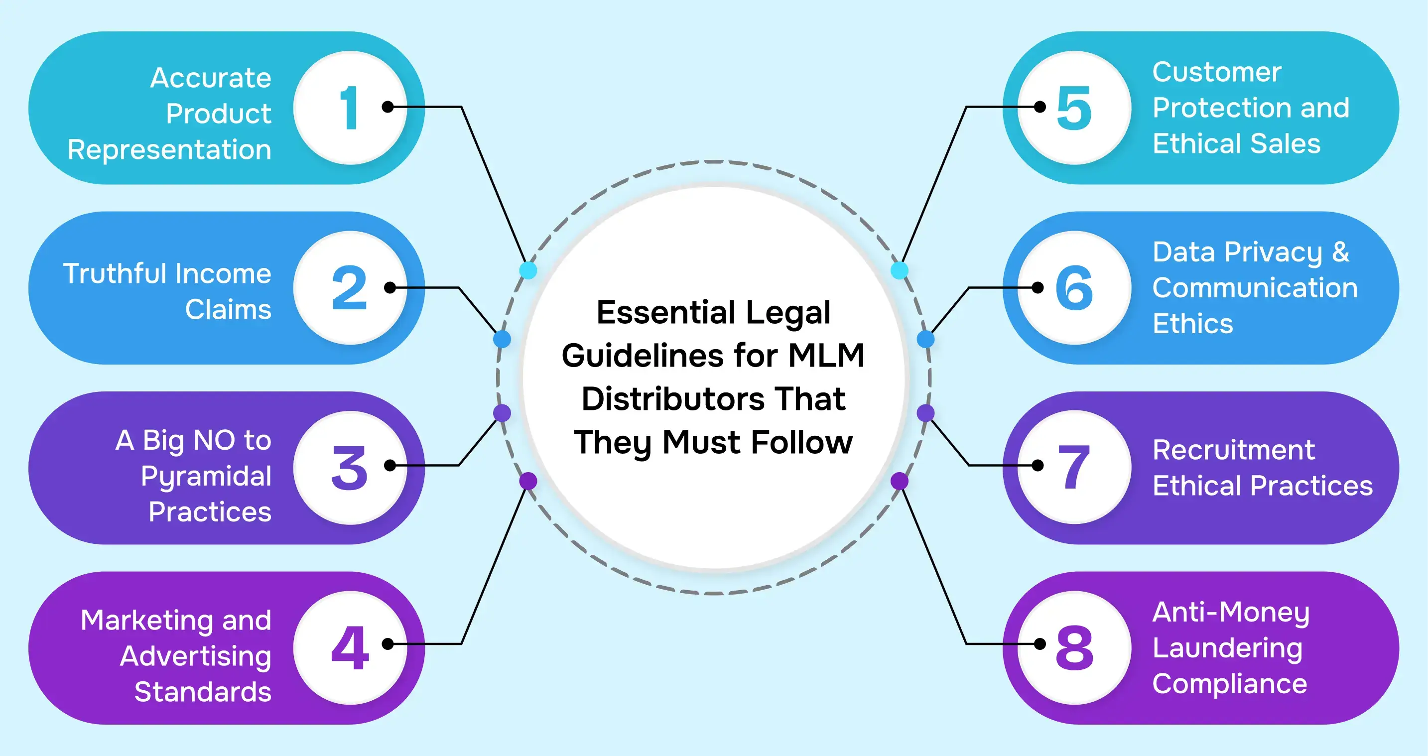Anti-Money Laundering Compliance: MLM distributors must ensure sharing only legitimate bank accounts that are not used for any anti-money laundering activities. They must not allow cash-based transactions that bypass company records.